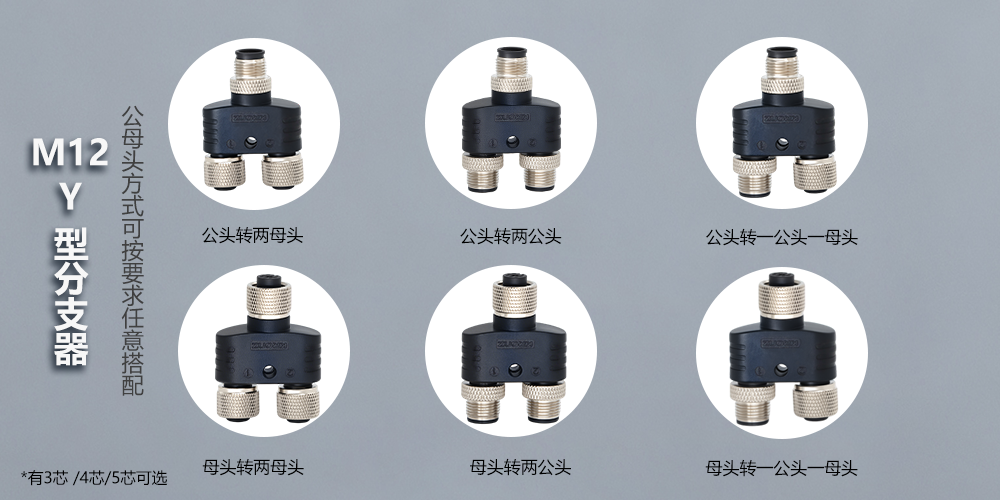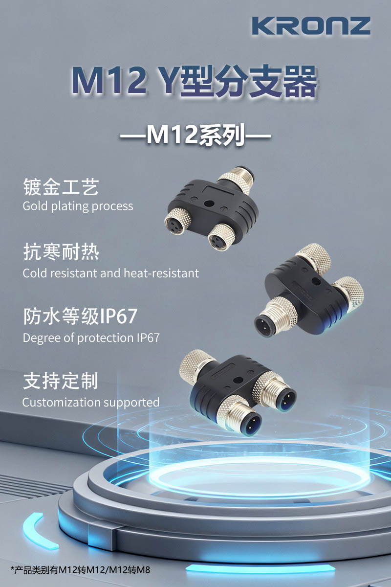 M12 Y 型分支器具有防水、防油、抗震、耐用等优点,目前已广泛应用于工业自动化、新能源、印刷、机器人、包装等核心工业领域,同时在户外照明、航空电子等对设备防护性能要求严苛的特殊场景中,也发挥着重要作用。