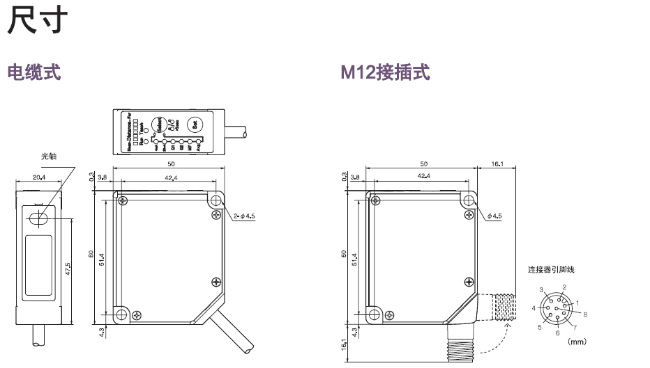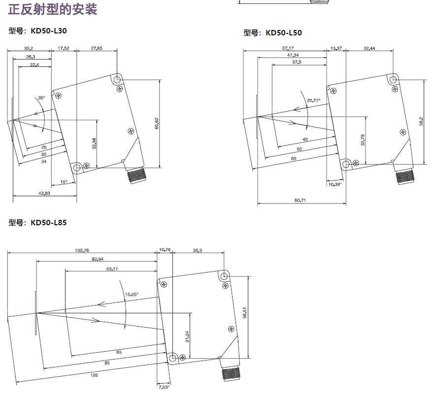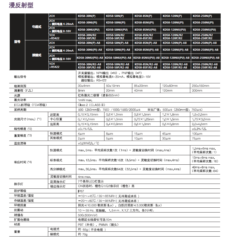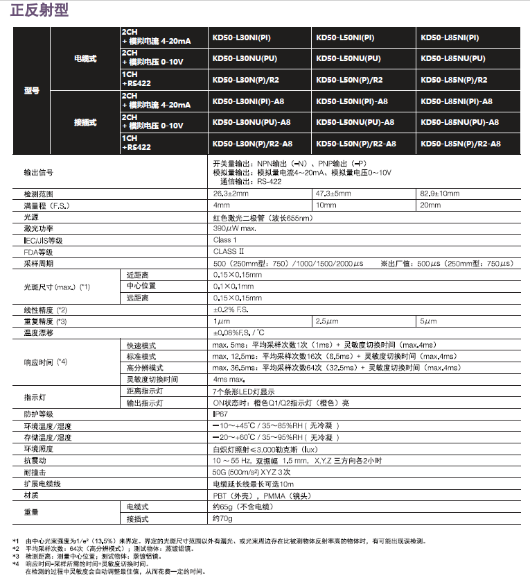 - KD50-L正反射型传感器适用于高反射性透明物体检测,提供RS422通信型。